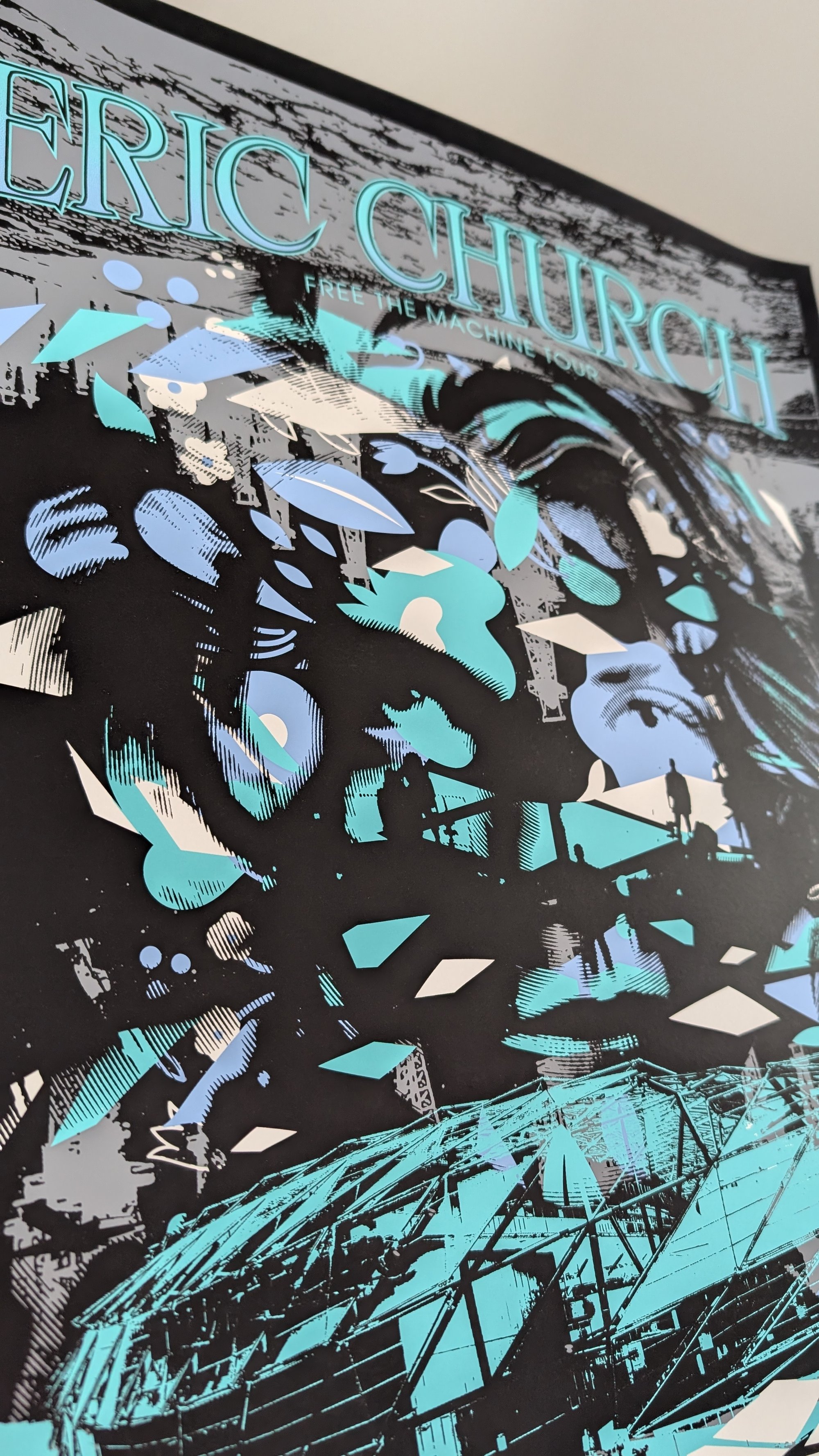 The official Eric Church screen printed show poster from the "Free The Machine Tour" stop in Inglewood, California at the Intuit Dome.